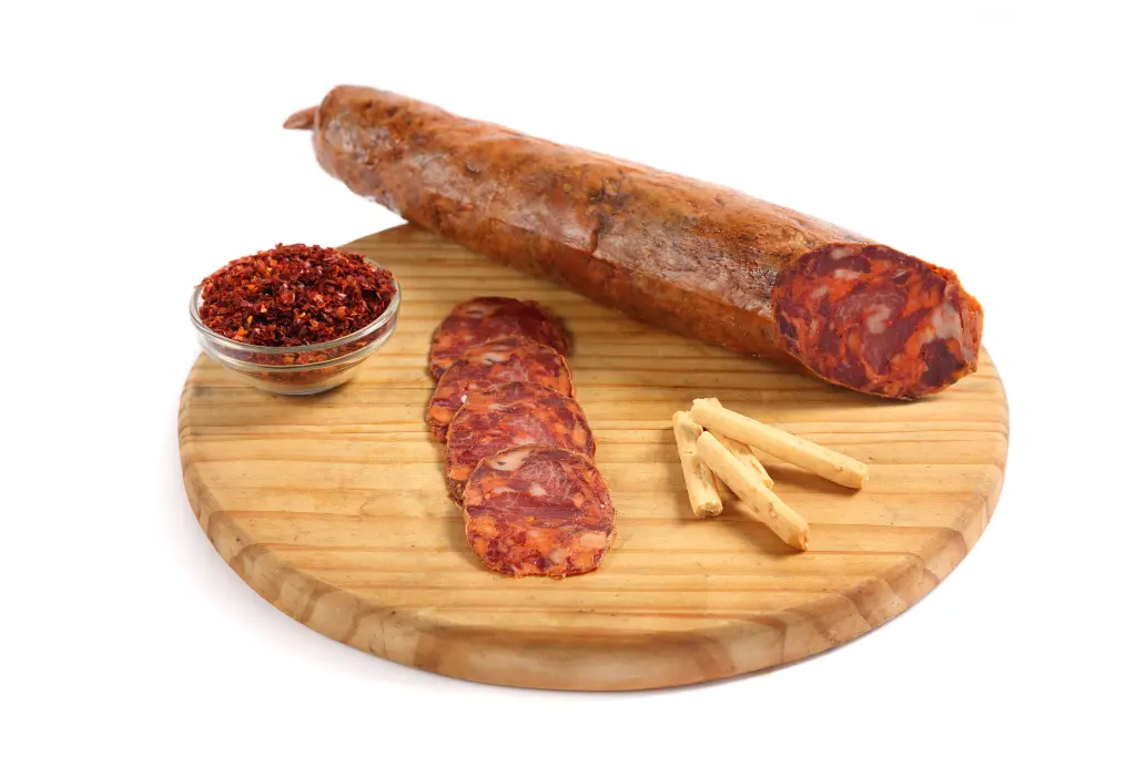 CHORIZO CULAR, DE BELLOTA 100% IBÉRICO. Para la fabricación de este embutido se utiliza cabeza de lomo y otros magros formados por los trozos más pequeños, con algunos restos de grasa, que le darán una mayor suavidad y sabor. El magro se pasa por la picadora con una placa de 6 mm. Es muy importante que esté bien frío (a 0º C aproximadamente) al objeto de que al picarlo el corte sea limpio y no se produzcan desgarros de las fibras. A continuación se introduce en la amasadora y se le añade los aliños siguientes: Sal, ajo, pimentón, pimienta negra molida, etc. Se amasa hasta que la pasta esté bien mezclada, se pasa a recipiente de acero inoxidable y se mantiene en cámara frigorífica al menos doce horas para que macere. Pasado este tiempo se embute en tripa de cerdo. Puede ser cular, para el chorizo de este mismo nombre o fina (intestino delgado), que se denomina de rosario cuando se ate en trozos pequeños formando una ristra. Después se lleva a secadero natural hasta el final de su curación. En el caso del cular 2-3 meses y en los demás 4 semanas. Una vez curados, los envasamos al vacío, etiquetamos y están listos para la venta. Chorizo loncheado a mano y envasado al vacío en sobres de 100g.